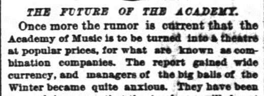 [2] HBO’s The Gilded Age did not stick with historical accuracy on this point and instead depicted the Academy of Music as empty.  On the show, Mrs. Fish described the Academy as a morgue, but historically the Academy performance on this date was well attended.